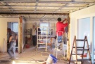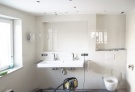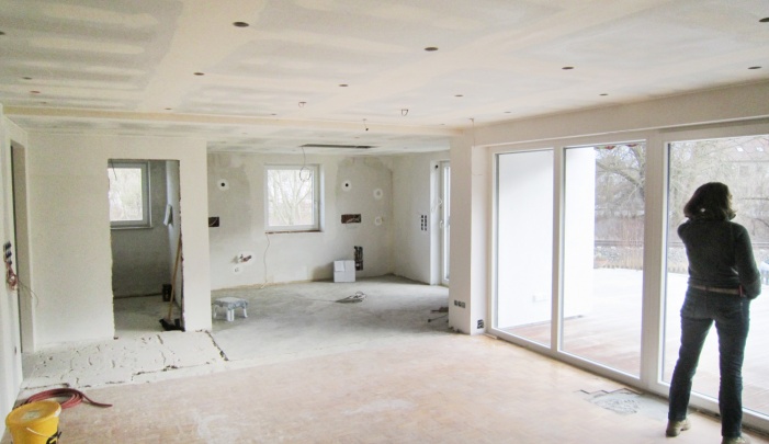 Um eine großzügigere Raumaufteilung und somit eine offenere Raumstruktur zu erreichen, entkernten wir das Haus zunächst komplett und zogen anschließend neue Wände ein. Sämtliche Elektrik installierten wir dabei neu, genauso die Ab- und Zuwasserleitungen sowie ein neues Wandheizungssystem, das hinter Vorsatzschalen montiert wurde.