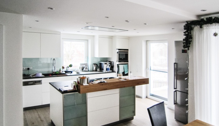 Um eine spezielle Lichtinstallation realisieren und gleichzeitig die entsprechende Verkabelung verstecken zu können, hängten wir sämtliche Decken ab. Ein komplett neues Bad, eine größtenteils neue Küche und ein Pelletofen rundeten den Innenausbau ab.