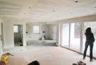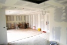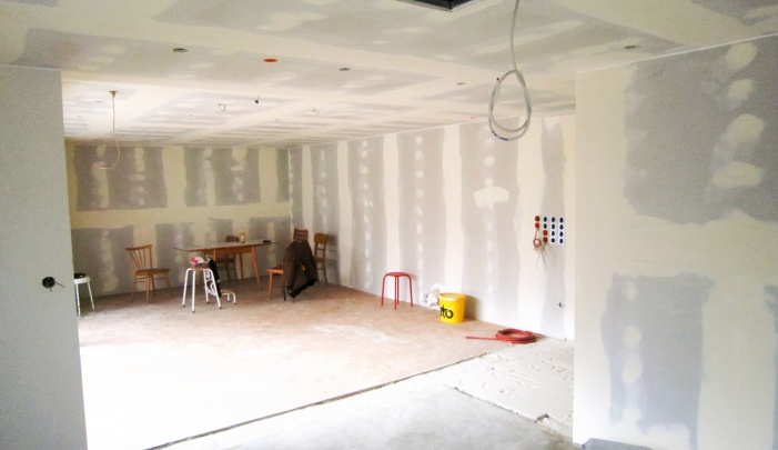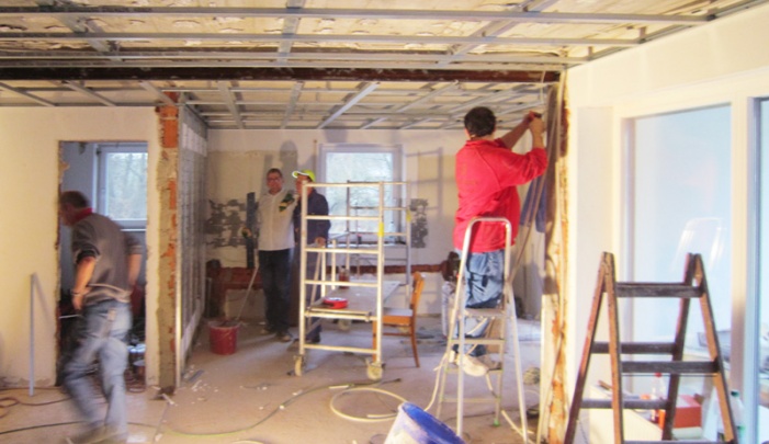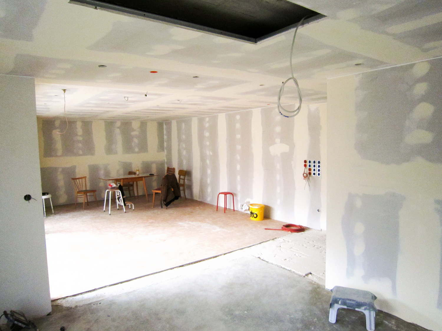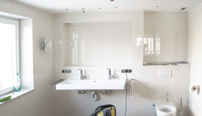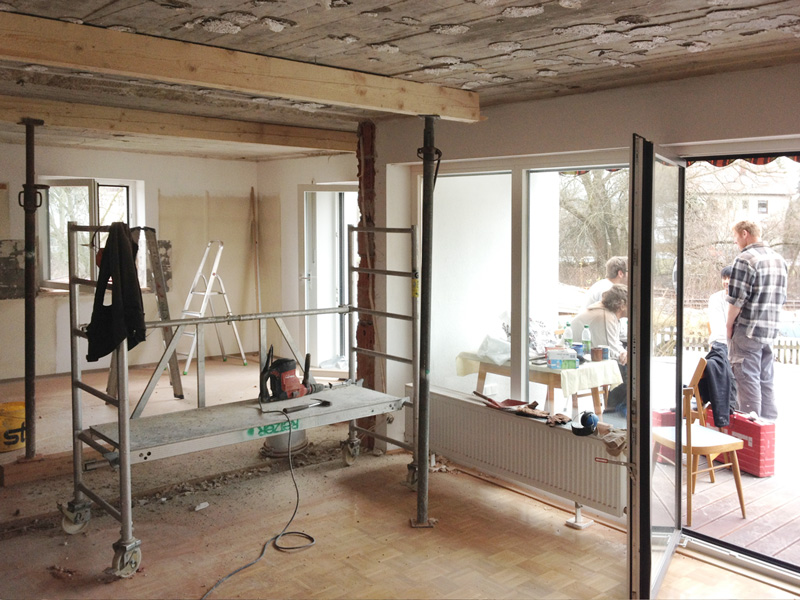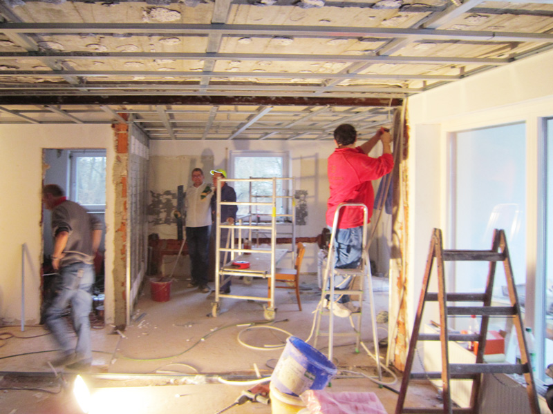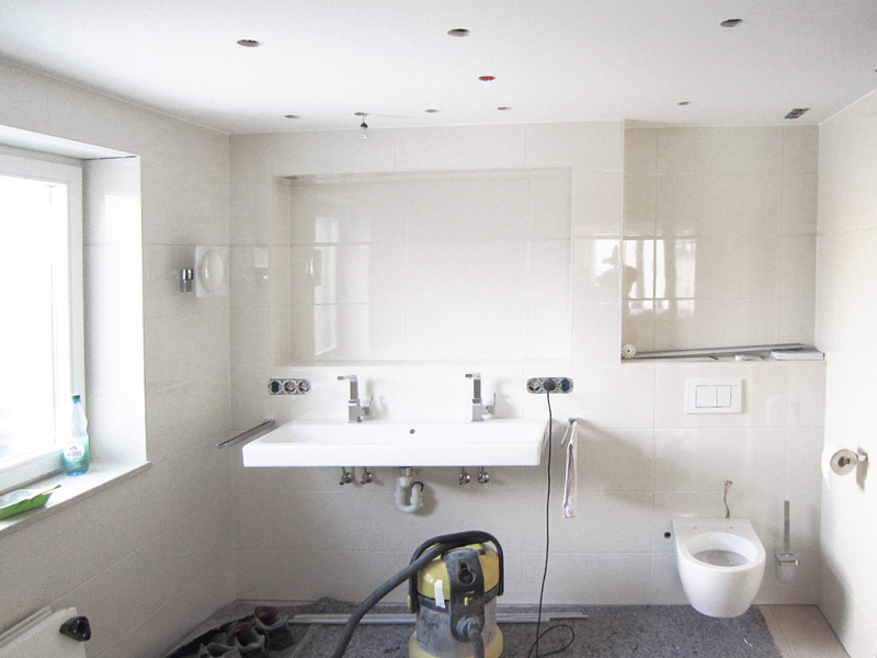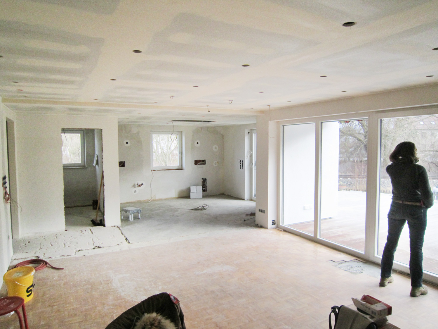 Um eine großzügigere Raumaufteilung und somit eine offenere Raumstruktur zu erreichen, entkernten wir das Haus zunächst komplett und zogen anschließend neue Wände ein. Sämtliche Elektrik installierten wir dabei neu, genauso die Ab- und Zuwasserleitungen sowie ein neues Wandheizungssystem, das hinter Vorsatzschalen montiert wurde.