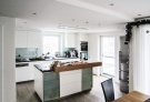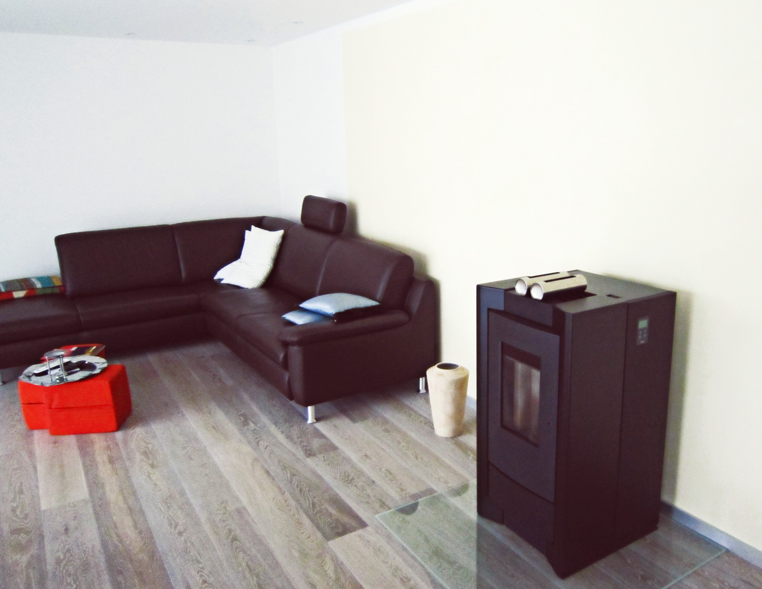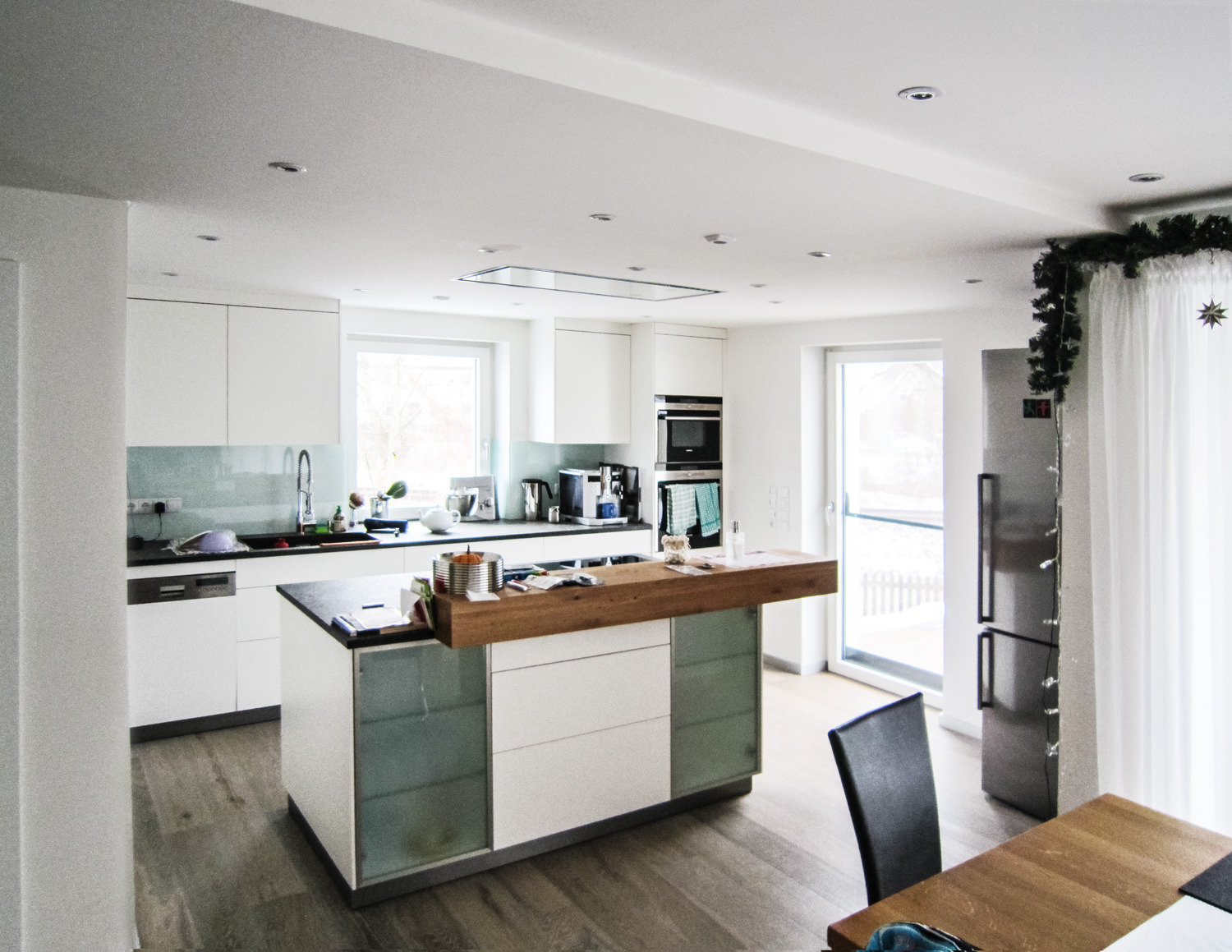 Um eine spezielle Lichtinstallation realisieren und gleichzeitig die entsprechende Verkabelung verstecken zu können, hängten wir sämtliche Decken ab. Ein komplett neues Bad, eine größtenteils neue Küche und ein Pelletofen rundeten den Innenausbau ab.